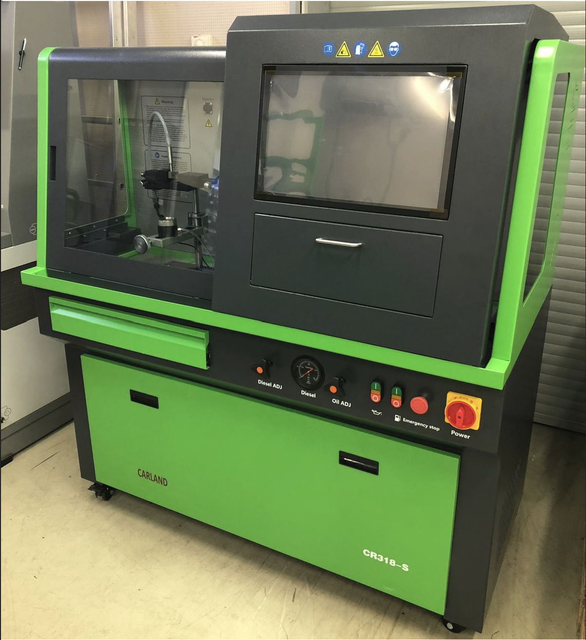 CARLAND CR318-S — стенд напольной установки, оснащенный встроенным цветным экраном рабочего компьютера и возможностью сенсорного управления как с экрана, так и с внешней клавиатуры (приобретается дополнительно). Управление стенда на английском языке. CARLAND CR318-S оснащен операционной системой Windows. В памяти стенда большая база данных параметров форсунок, с возможностью сохранения результатов тестирования с привязкой к каждому тестированию и клиенту. Программное обеспечение и база данных обновляются автоматически (требуется подключение к Интернету) или вручную.